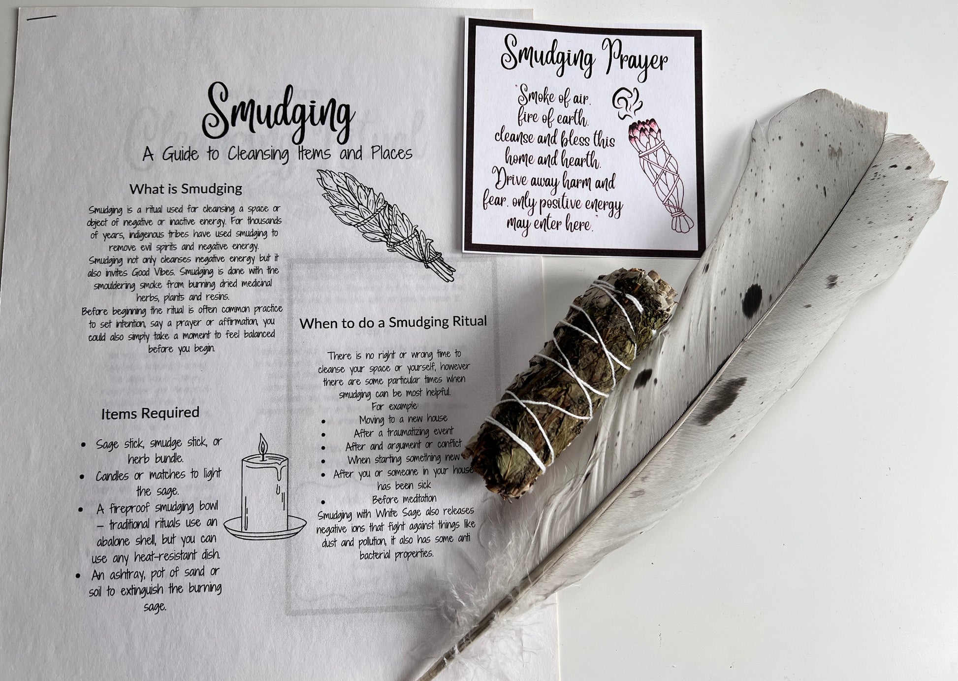 Also available is the Sage Bundle Kit. This includes a guide to smudging, smudging prayer card, and locally humanely sourced Royal Palm and Lavender Turkey feather.