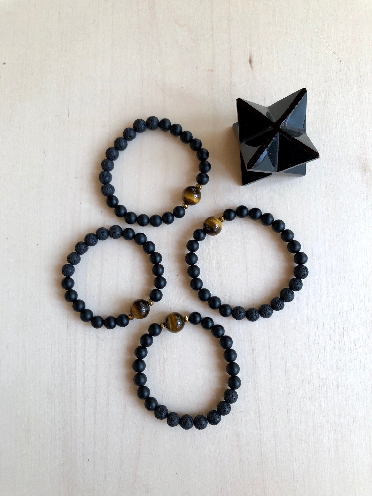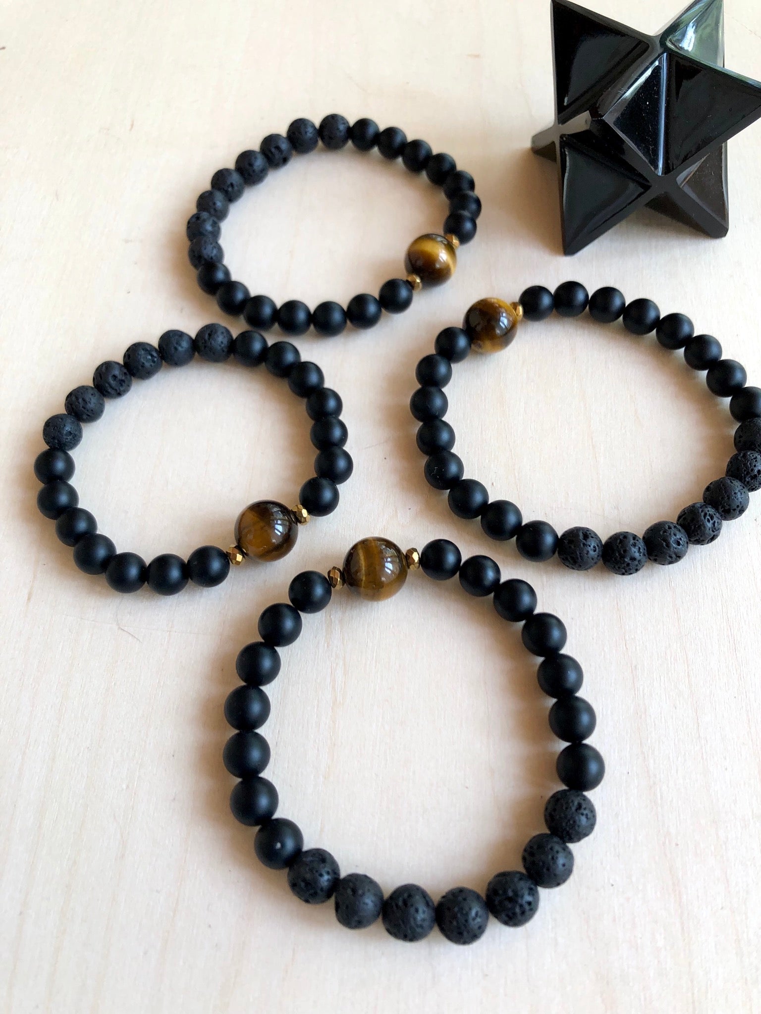 Here we have Onyx and Lava with a Tiger Eye guru to lead you into transforming your life courageously. The Onyx is a stone of protection, the lava represents the transformation and can be used to diffuse essential oils, and the Tiger Eye is for courage. They are great for men and women and come in all sizes.