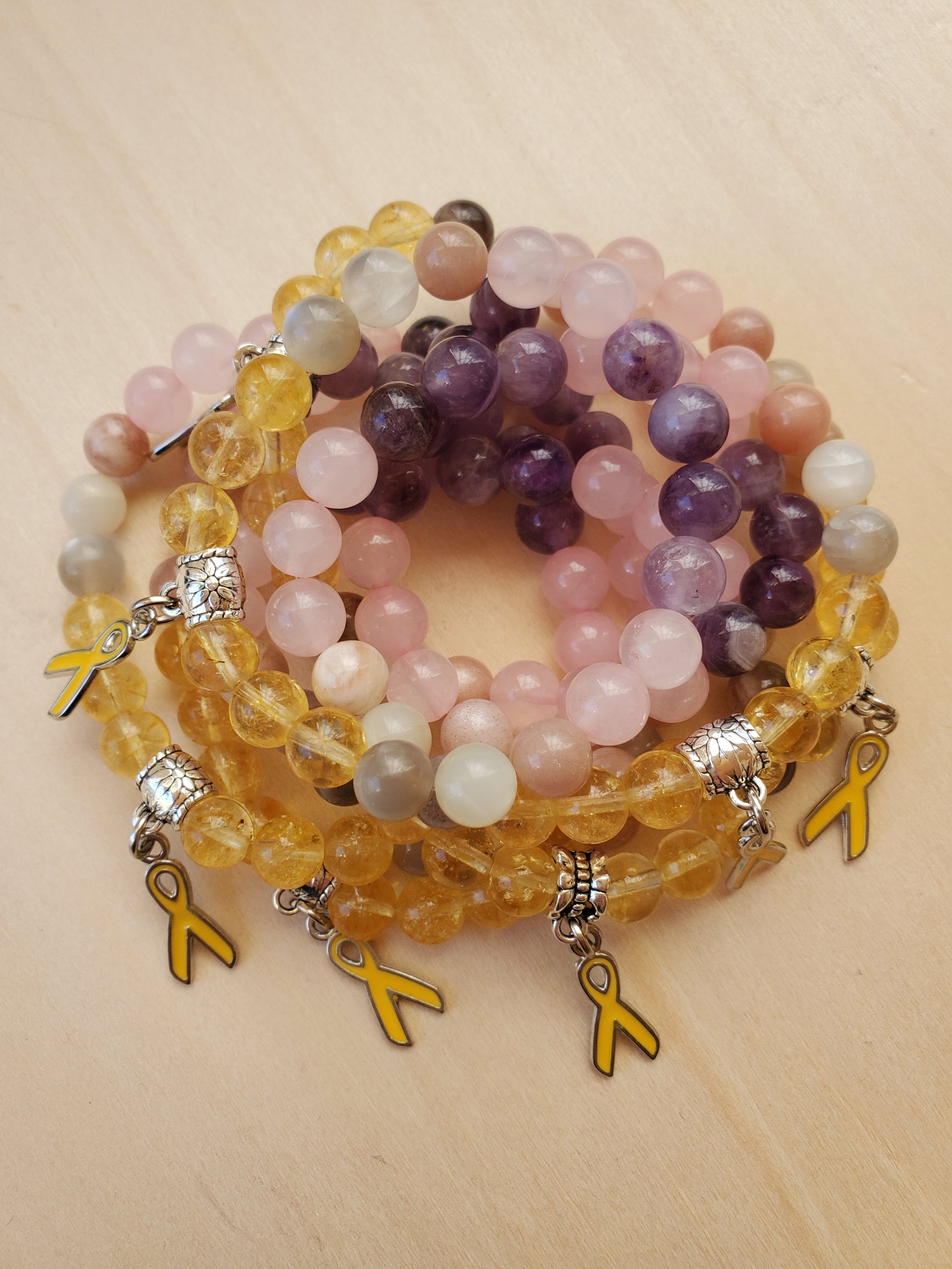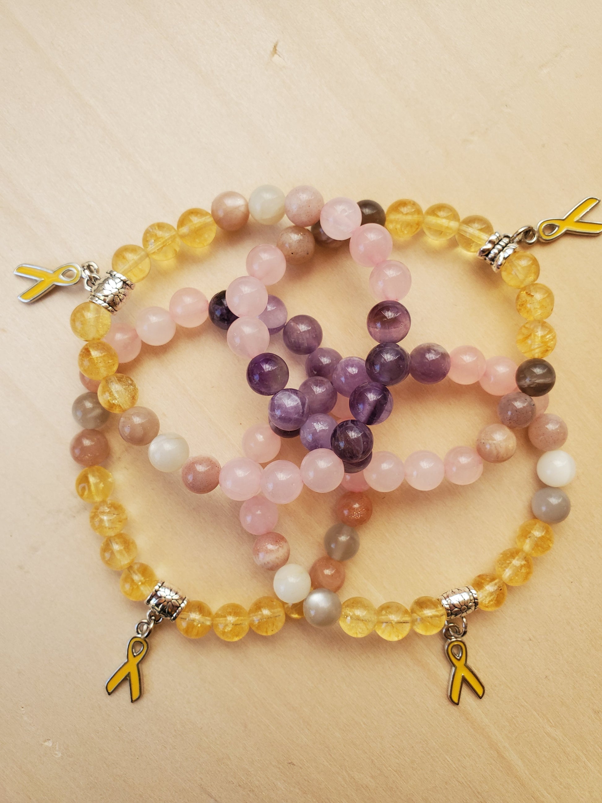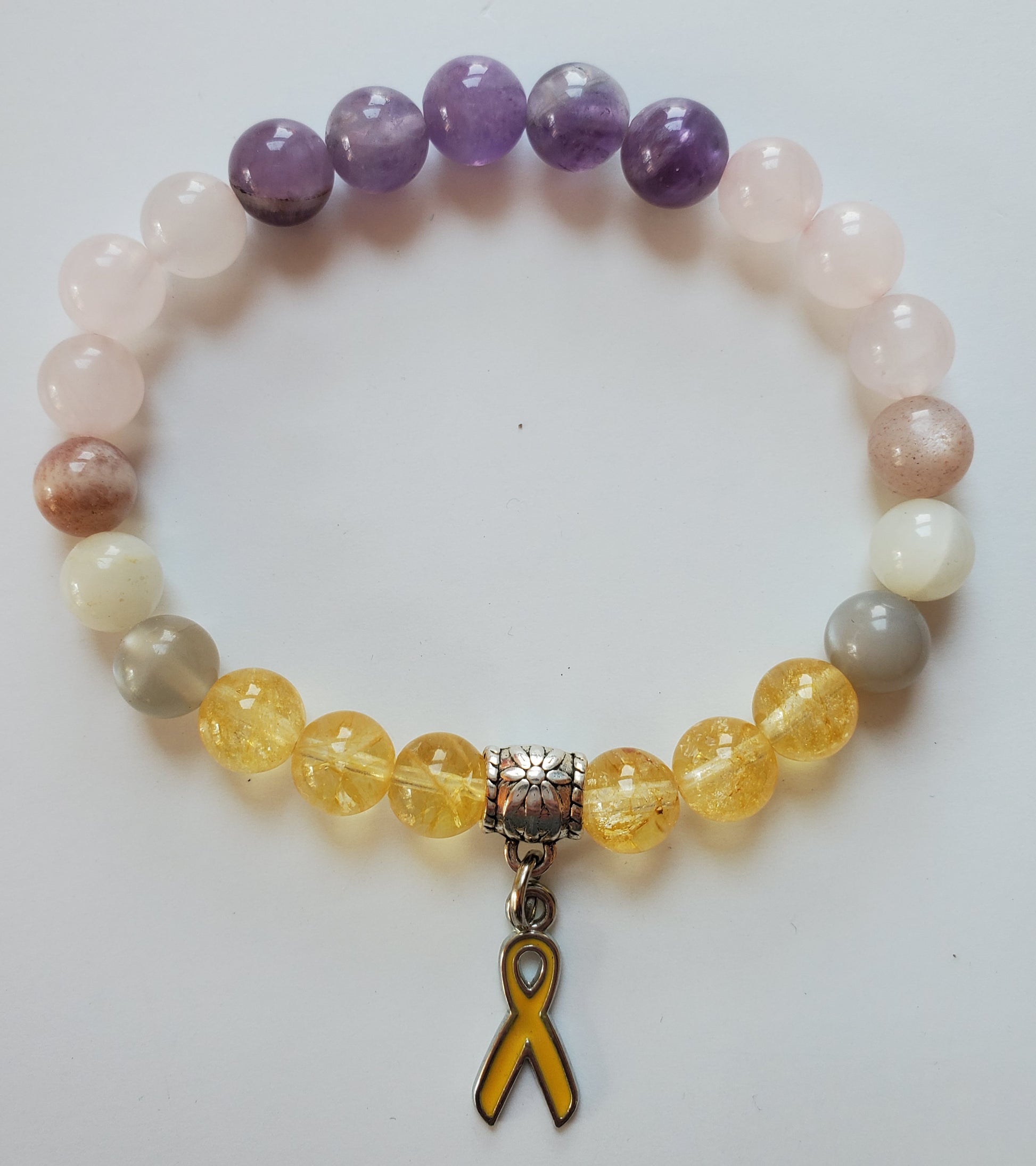 These bracelets have the yellow endometriosis awareness ribbon charm. Citrine gives energy and positivity. Moonstone offers healing energy to sacral chakra and reproductive area. Rose Quartz offers self love during this difficult journey with the body. Amethyst ignites intuitive guidance around healing.