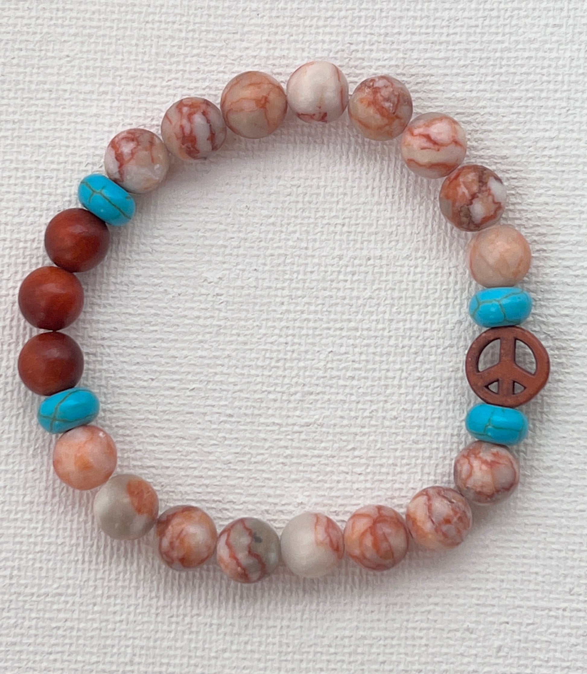 This Red Vein Jasper helps prevail against ill will and allows Peace to enter the Aura. The howlite peace sign reminds us to offer Peace First. Wood brings extra grounding.