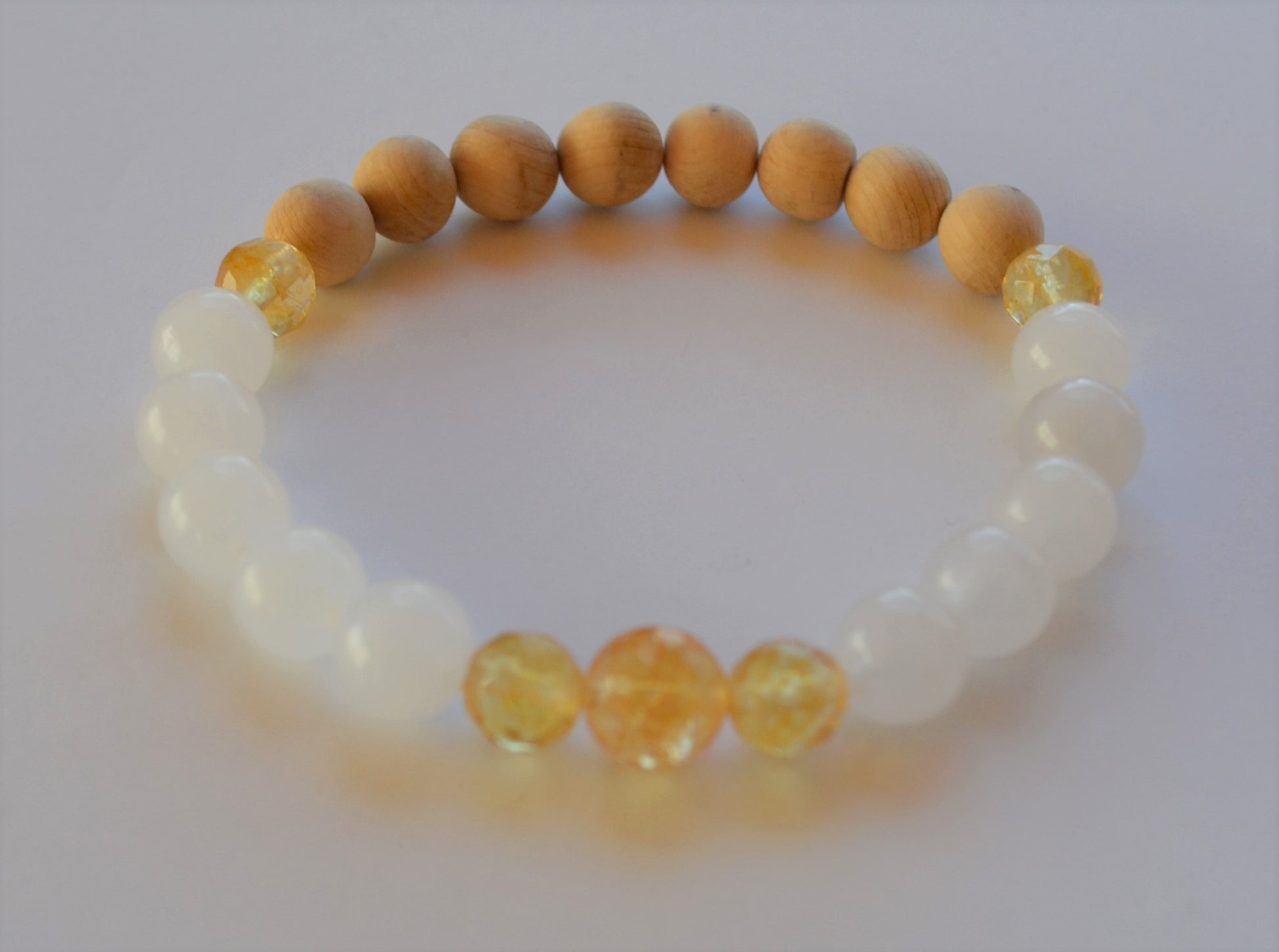 White Jade is known for it's purifying energy. It can remove negativity and cleanse the aura and mind. Citrine offers the renewing energy of the Sun. Wood to ground and to apply your favorite essential oils.